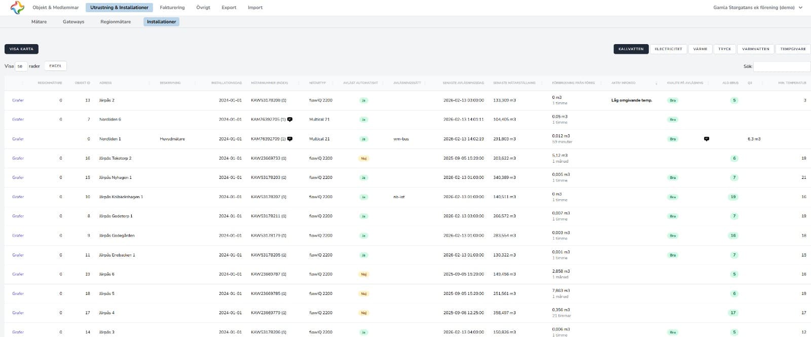 - Kartvy som visar mätarna geografiskt och ger snabb kontroll över status (t.ex. kommunikation/avvikelse beroende på konfiguration) – vilket förenklar drift, tillsyn och felsökning.